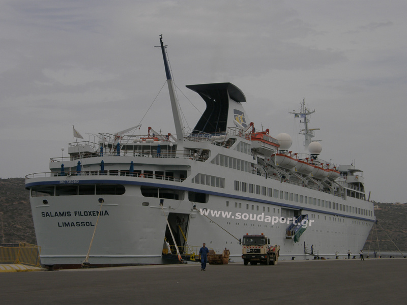 Σήμερα το πρωί, γύρω στις 10:00, κατέπλευσε στο λιμάνι της Σούδας το κρουαζιερόπλοιο «SALAMIS FILOXENIA» της Cruise Cyprus, αδελφό πλοίο του «DELPHIN» που κατέπλευσε εχτές. Το πλοίο ήταν προγραμματισμένο να καταπλεύσει στις 7:00 και να αποπλεύσει στις 12, αλλά λόγω της καθυστέρησης θα αποπλεύσει στις 14:30. Η Σούδα είναι ο τελευταίος του προορισμός με λιμάνι κατάληξης και αφετηρία, τη Λεμεσό, όπου αναμένεται να καταπλεύσει αύριο το απόγευμα στις 18:00.