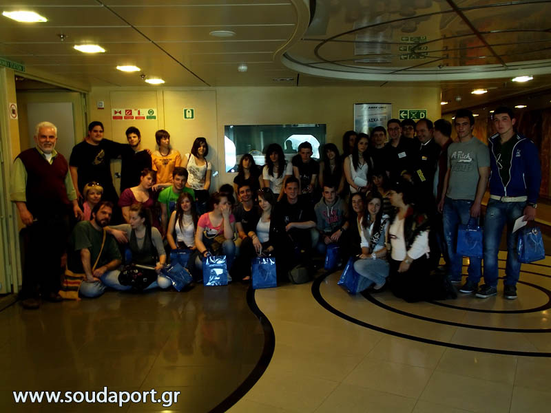 Και έτσι φτάνουμε στην Σούδα, σήμερα Σάββατο 9 Απριλίου του 2011. Τα παιδιά αυτά όπως είδατε δεν βλέπουν θάλασσα, πόσο μάλλον πλοία. Ζητήθηκε λοιπόν να επισκεφθούν το ΕΛΥΡΟΣ που σήμερα βρισκόταν στην προβλήτα Αδρίας του λιμανιού. Στις 16:00 τα 15 παιδιά της τρίτης Λυκείου του σχολείου των Πομακοχωρίων μαζί με 15 παιδιά των Χανίων που συμμετέχουν στο πιλοτικό πρόγραμμα ανταλλαγής μαθητών, επιβιβάζονται στο υπερπολυτελές ΕΛΥΡΟΣ για να ξεναγηθουν από το πλήρωμα. Μεταξύ άλλων επισκεφθήκαμε καμπίνες, όλους τους κοινόχρηστους χώρους του πλοίου, το εξωτερικό κατάστρωμα 9 και την γέφυρα. Η ANEK LINES ζήτησε από τους φωτογράφους Δημητριάδη Νίκο και Σουσιόπουλο Γιάννη, μέλη του ΛΙΜΕΝΑΣ ΣΟΥΔΑΣ, να δώσουν φωτογραφίες με πλοία της ΑΝΕΚ στα παιδιά για ενθύμιο. Έτσι μετά το πέρας της επίσκεψης δόθηκαν από δύο φωτογραφίες σε κάθε μαθητή και μαθήτρια, καθώς και δύο μεγάλες φωτογραφίες για το σχολείο, οι οποίες δόθηκαν στους συνοδούς καθηγητές. Το ΛΙΜΕΝΑΣ ΣΟΥΔΑΣ στηρίζει έμπρακτα κάθε προσπάθεια πολιτισμού και ενημέρωσης και σήμερα το απέδειξε, όπως και η ΑΝΕΚ η οποία έδωσε και μία τσάντα με αναμνηστικά δώρα στα παιδιά. Ακολουθούν μερικές φωτογραφίες: