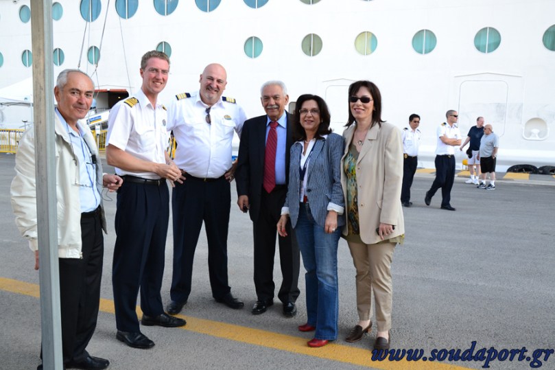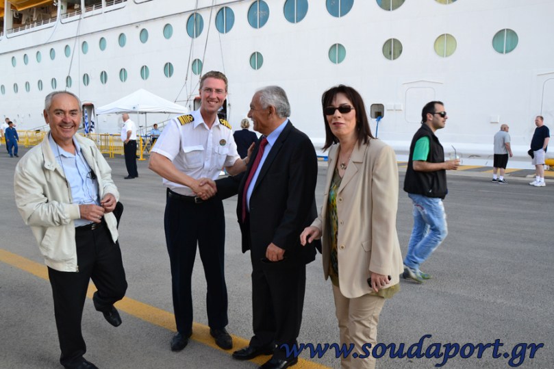 Στην προβλήτα υποδέχθηκαν τον πλοίαρχο του πλοίου ο δήμαρχος Χανίων κ. Σκουλάκης (κέντρο), ο πράκτορας της RCC στα Χανιά κ. Τσαγκαράκης (αριστερά) και η κ. Κοκκινάκη (δεξιά) υπεύθυνη Τουρισμού του δήμου Χανίων.