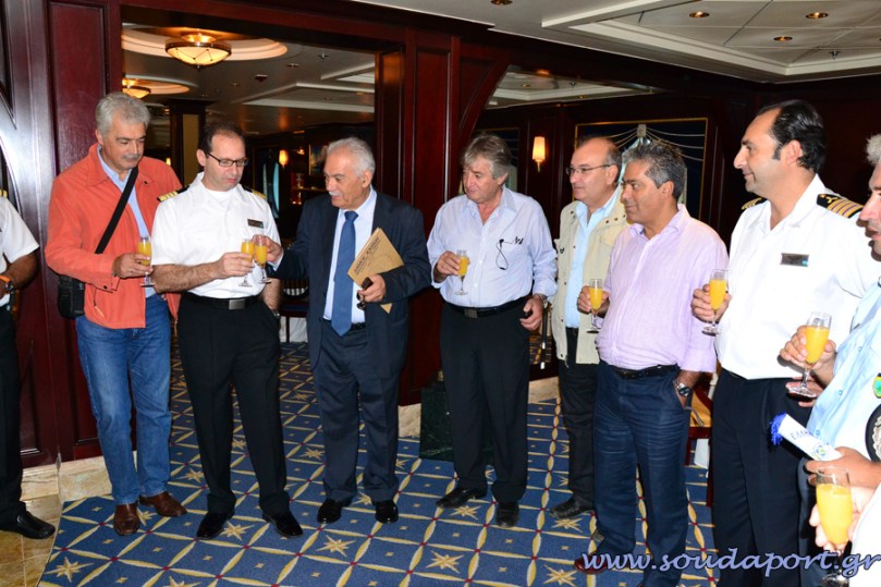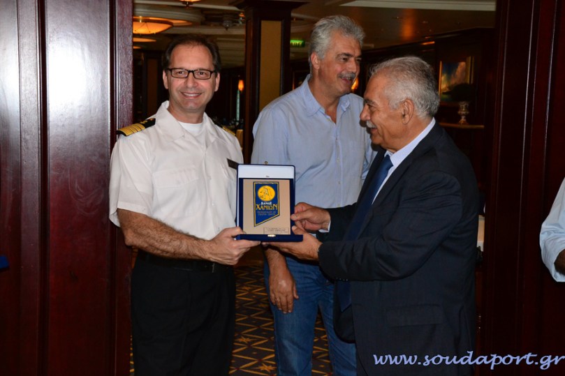 Στις 9:45 επιβιβαζόμαστε στο πλοίο προκειμένου να γίνει η ανταλλαγή δώρων και πλακετών του Δήμου Χανίων και του πλοιάρχου του Celebrity CONSTELLATION.