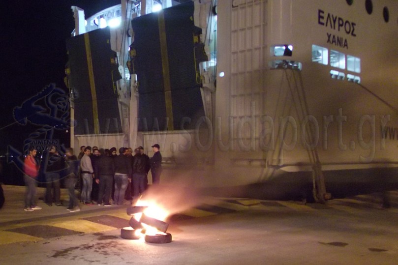 Λόγω του πλήθους των φορτηγών οχημάτων, οι Χανιώτες αγρότες δεν κατάφεραν να φορτώσουν τα οχήματά τους στο γκαράζ του πλοίου και έτσι σήμερα το απόγευμα βρέθηκαν στο λιμάνι της Σούδας προκειμένου να φορτώσουν τα προιόντα τους στο ΕΛΥΡΟΣ.