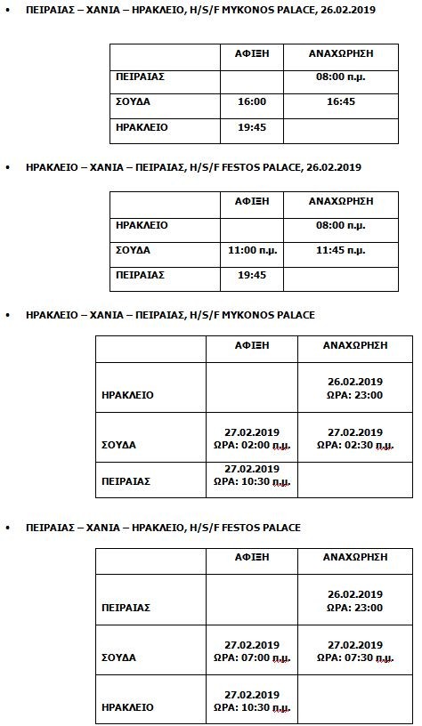 Οι ΜΙΝΩΙΚΕΣ ΓΡΑΜΜΕΣ γνωστοποιούν στο επιβατικό κοινό ότι λόγω εργασιών αποκατάστασης ζημιάς στην προβλήτα λιμένος Πειραιά που πραγματοποιεί ο Οργανισμός Λιμένος Πειραιά, από την Παρασκευή 01 Μαρτίου 2019 τα πλοία της εταιρείας από τη θέση της Ακτής Ηετίωνος, Πύλη Ε2, θα μεταβούν και θα χρησιμοποιούν προσωρινά τη θέση, που βρίσκεται στην Ακτή Βασιλειάδη, Πύλη Ε2 (πίσω από το Υπουργείο Ναυτιλίας και Νησιωτικής Πολιτικής), προκειμένου να εκτελούν τα προγραμματισμένα δρομολόγιά τους από το λιμάνι του Πειραιά προς τα λιμάνια του Ηρακλείου και τωνΧανίων.