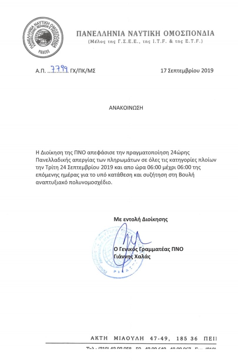 Σε μία ακόμη απεργία προχωρά η Πανελλήνια Ναυτική Ομοσπονδία στις 24/9 κρατώντας τα πλοία δεμένα στα λιμάνια.