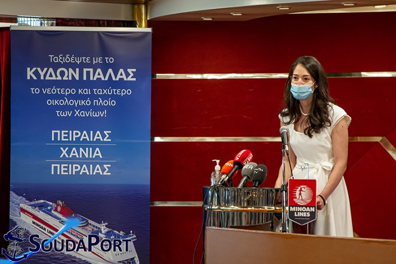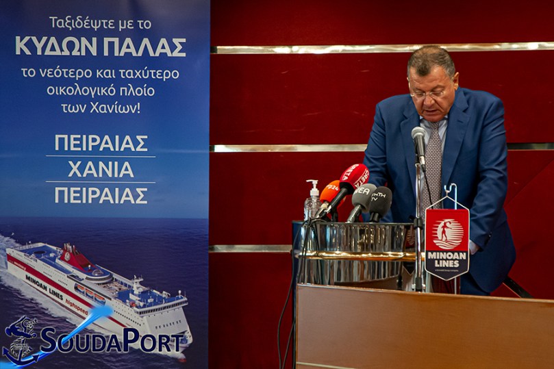 Την εκδήλωση άνοιξε ο Διευθύνων Σύμβουλος των Μινωικών Γραμμών, κ. Αντώνιος Μανιαδάκης, με την ομιλία του να επικεντρώνεται στην αφοσίωση των Μινωικών Γραμμών στην συνεχή αναβάθμιση των υπηρεσιών και επέκταση των δραστηριοτήτων της, μέρος των οποίων είναι και η δρομολόγηση του ΚΥΔΩΝ ΠΑΛΑΣ, του νεότερου, ταχύτερου και οικολογικότερου πλοίου της γραμμής. Στόχος της εταιρείας, μέσω της δρομολόγησης του ΚΥΔΩΝ ΠΑΛΑΣ στη γραμμή Πειραιάς-Χανιά-Πειραιάς είναι να προσφέρει στο επιβατικό κοινό και τους συνεργάτες της ασφαλείς ποιοτικές και αξιόπιστες υπηρεσίες μετατρέποντας το ταξίδι τους σε μία μοναδική και αξέχαστη εμπειρία.