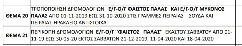Με αίτημά τους προς το Συμβούλιο Ακτοπλοϊκών Συγκοινωνιών οι Μινωικές Γραμμές αιτούνται την περικοπή των δρομολογίων εκάστου Σαββάτου του πλοίου ΦΑΙΣΤΟΣ ΠΑΛΑΣ στην γραμμή Πειραιάς-Χανιά από 01/11/2019 έως 30/05/2020 εκτός των Σαββάτων 21/12/2019, 11/04/2020 και 18/04/2020.
